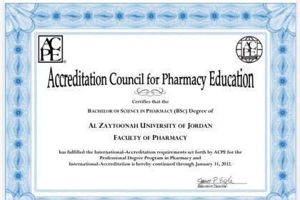 تجديد الاعتماد الأمريكي الدولي (ACPE) لكلية الصيدلة في جامعة الزيتونة الأردنية لمدة ستة سنوات