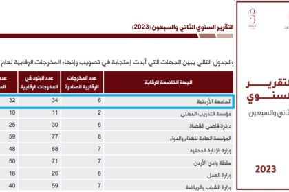 وفقًا لتقريرِ ديوانِ المُحاسبةِ للعام 2023الجامعةُ الأردنيّةُ تحقّقُ أعلى نسبة استجابةٍ في الأردنّ لتصويبِ المخرجاتِ الرّقابيّةِ وإنهائها