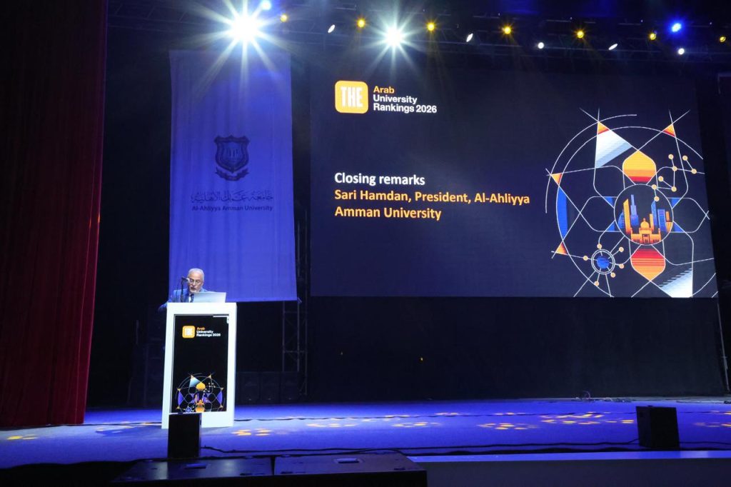 · وخلال حفل الختام، عبّر الأستاذ الدكتور ساري حمدان، رئيس جامعة عمّان الأهلية، عن اعتزازه بالنتائج التي حققتها الجامعة في التصنيف ، موجّهًا الشكر لجميع المشاركين ومهنئًا الجامعات التي ظهرت ضمن التصنيف.