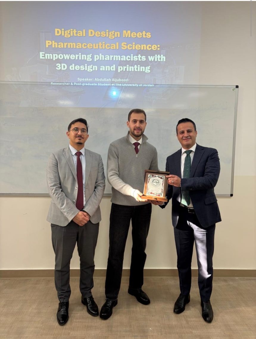 “Digital Design Meets Pharmaceutical Science: Empowering Pharmacists with 3D Design and Printing”، قدّمها الدكتور عبدالله الجبوري، بحضور عميد الكلية الأستاذ الدكتور علاء الحسبان، ونائب العميد الدكتور محمد الوحش، وعدد من أعضاء الهيئة التدريسية وطلبة الكلية.
