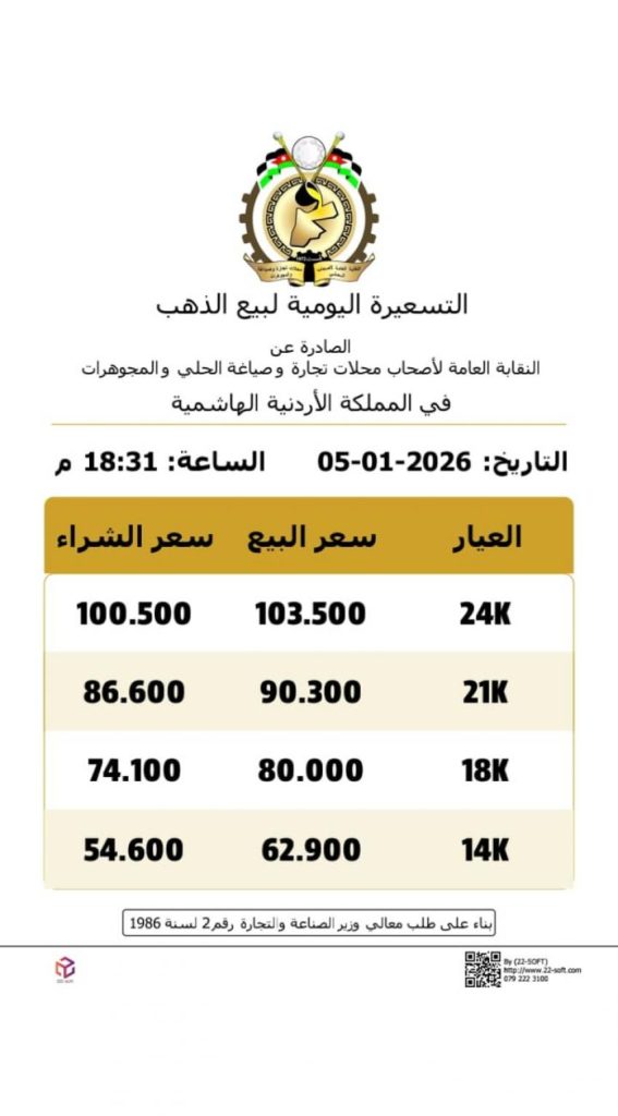 ووصل سعر بيع غرام الذهب عيار 21، في السوق المحلية، إلى 90.3 دينارا لغايات البيع من محالّ الصاغة، مقابل 86.60 دينارا لجهة الشراء.