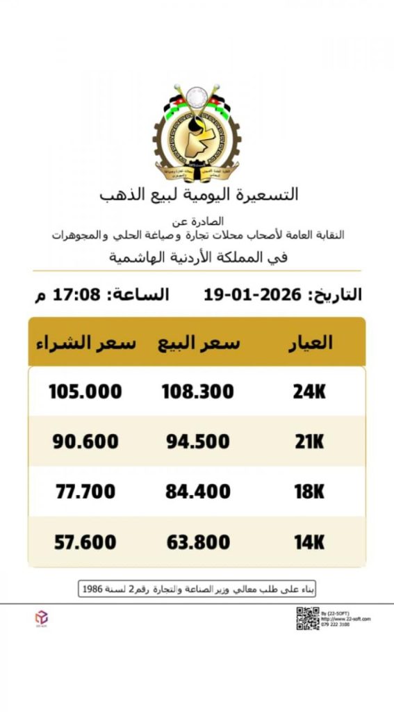 ووفق التسعيرة الثانية الصادرة عن النقابة العامة لأصحاب محالّ تجارة وصياغة الحلي والمجوهرات، سجّل سعر بيع غرام الذهب عيار 21 في السوق المحلية، 94.50 دينارا لغايات البيع من محالّ الصاغة، مقابل 90.60 دينارا لجهة الشراء