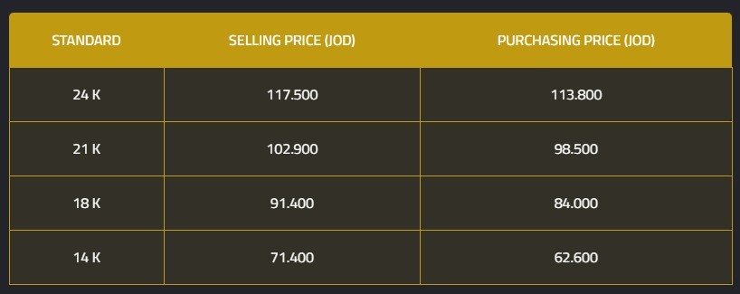 وارتفع سعر الذهب عيار 21 قيراطاً – الأكثر تداولاً في السوق المحلي – ليصل إلى 102.900 دينار للبيع مقابل 98.500 دينار للشراء.