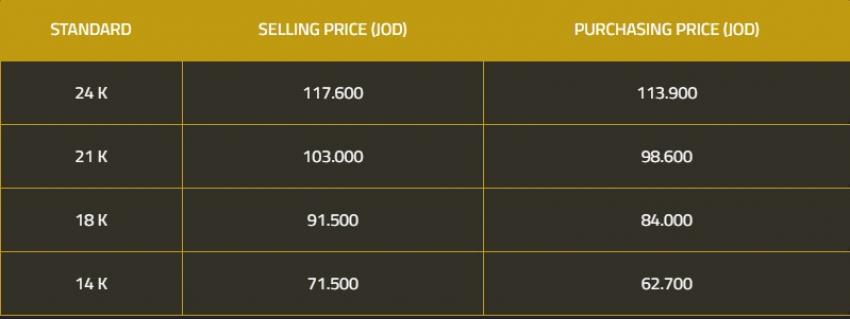 وكما بلغ سعر الغرام الواحد من الذهب عيارات 24 و18 و14 لغايات البيع من محالّ الصاغة 117.6 و91.5 و71.5 دينارا على التوالي.