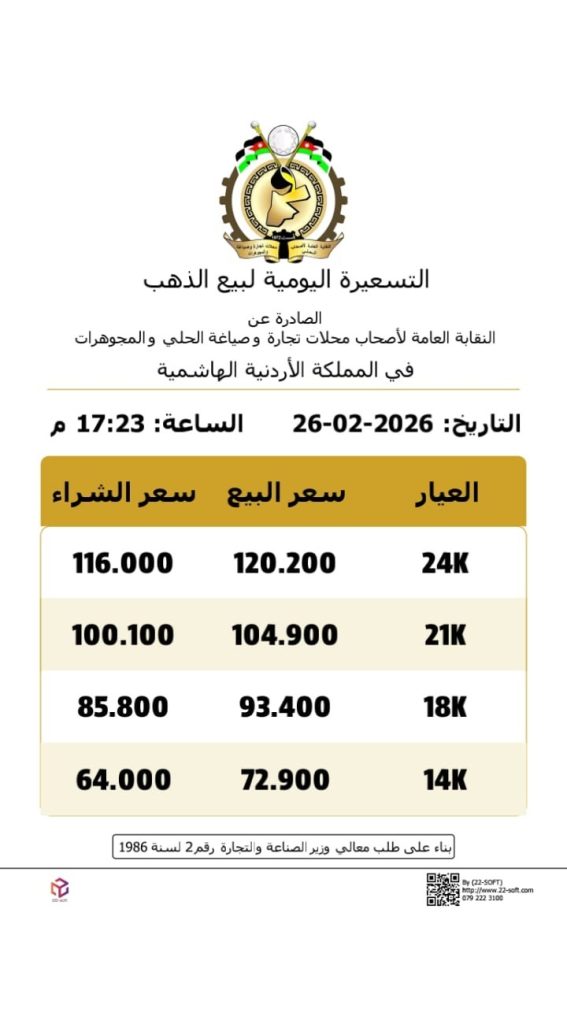 وبلغ سعر غرام الذهب عيار 21 الأكثر تداولا بين المواطنين 104.9 دينارا.
