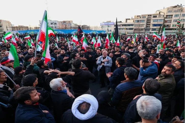 توجه آلاف الأشخاص، الأحد، إلى ساحة انقلاب في وسط طهران بعد إعلان مقتل المرشد الأعلى الإيراني علي خامنئي.