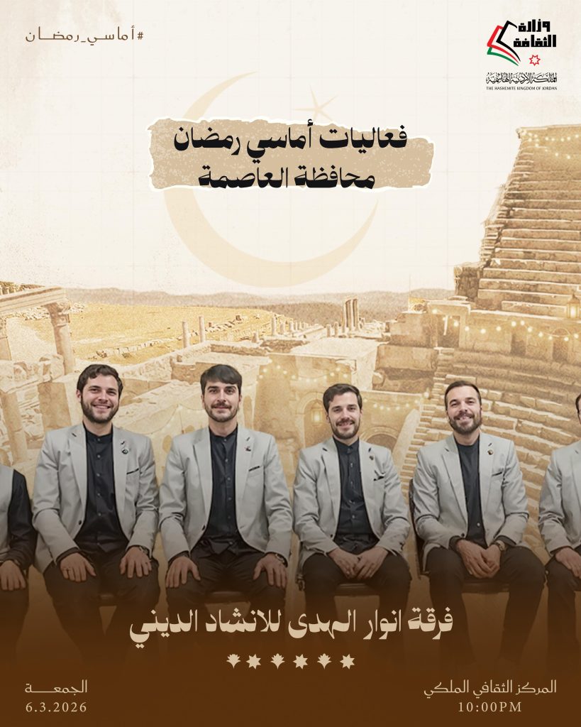 في محافظة العاصمة، يحتضن المركز الثقافي الملكي، يوم الخميس، عند الساعة التاسعة والنصف مساءً أمسية فنية تحييها فرقة جمعية شباب السلط للإنشاد الديني، إلى جانب الفنان محمد رمضان، فيما تتواصل الفعاليات يوم الجمعة مع عرض تقدمه فرقة أنوار الهدى للإنشاد الديني عند الساعة 10:00 مساءً، على المسرح ذاته.