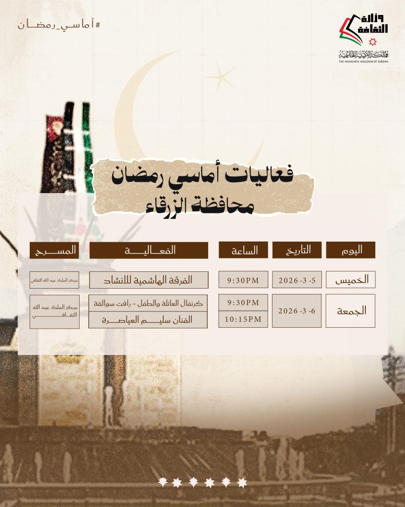 في محافظة الزرقاء، تقام يوم الخميس، عند الساعة التاسعة والنصف مساءً، في مركز الملك عبد الله الثاني الثقافي، أمسية فنيّة للفرقة الهاشمية للإنشاد. ويحتضن مركز نفسه، يوم الجمعة، كرنفالا للعائلة والطفل، يقدمه الفنان رأفت السوالقة، الساعة التاسعة والنصف مساءً، فيما يقدم الفنان سليم العياصرة أمسية فنيّة، الساعة العاشرة والربع مساءً.