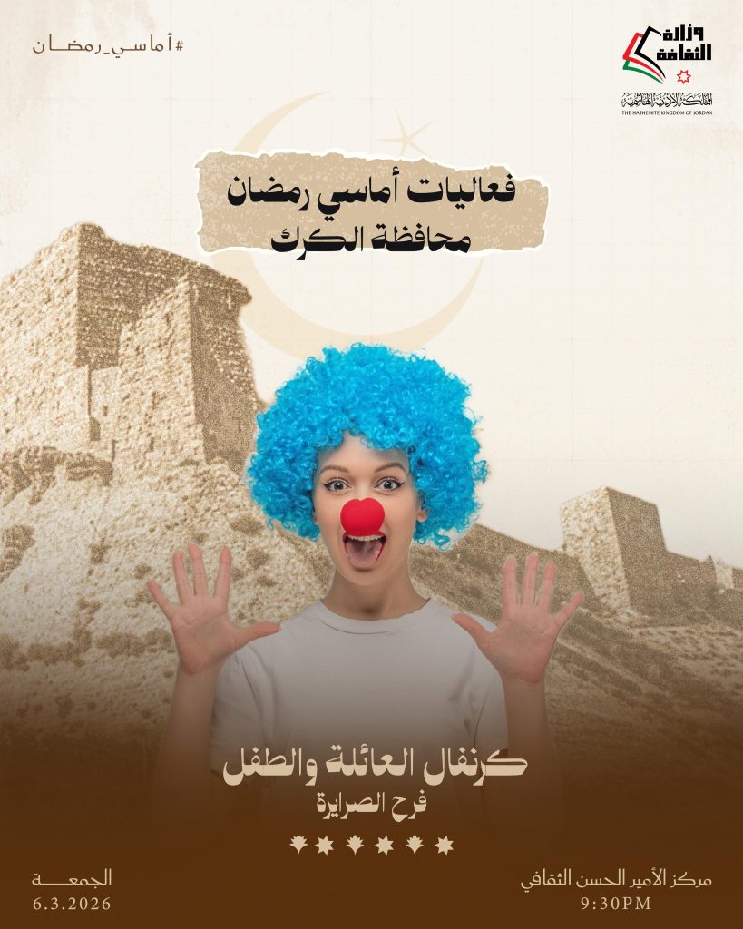في محافظة الكرك، يستضيف مركز الأمير الحسن الثقافي، يوم الخميس، الساعة العاشرة مساءً، حفلًا إنشاديًا تحييه فرقة «أنوار الشام» من سوريا. ويقام في المركز نفسه، يوم الجمعة، الساعة التاسعة والنصف مساءً، كرنفال للعائلة والطفل، يقدمه الفنانة فرح الصرايرة، فيما يقدم الفنان فادي رأفت أمسية فنيّة، الساعة العاشرة والربع مساءً.