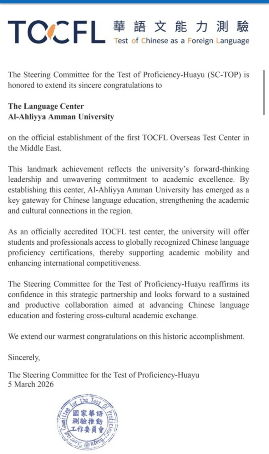 عمّان الأهلية تُعتمد كأول مركز دولي لاختبار TOCFL للغة الصينية في الشرق الأوسط