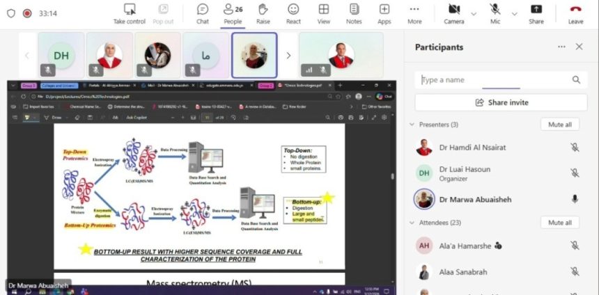 في إطار السعي المستمر لتطوير الكفاءات العلمية، نظمت كليتا الدراسات العليا والصيدلة في جامعة عمان الاهلية ورشة عمل علمية متخصصة بعنوان: ”Proteomic Technologies: Sequencing and Mass Spectrometry for biological system investigation” وقدمت الورشة الدكتورة مروة أبو عيشة عبر “منصة التميز”، مستهدفةً بشكل أساسي تعزيز قدرات طلبة الدراسات العليا في تخصص العلوم الصيدلانية وتزويدهم بالأدوات الحديثة اللازمة للتميز البحثي. وتأتي هذه الورشة استكمالاً لسلسلة من ورش العمل المتخصصة التي تم تنظيمها لتشمل العديد من تخصصات الماجستير في الجامعة، وذلك ضمن رؤية مؤسسية تهدف إلى تمكين الباحثين في مختلف الحقول العلمية. وقد تناولت الورشة شرحاً معمقاً لأحدث تقنيات قياس الطيف الكتلي (Mass Spectrometry) وتسلسل البروتينات، مع التركيز على كيفية توظيف هذه التقنيات المتقدمة في استقصاء الأنظمة البيولوجية. وتهدف هذه المبادرة إلى تمكين طلبة الماجستير من تطبيق أدوات التحليل الدقيق في أبحاثهم الصيدلانية، مما يساهم في رفع سوية المخرجات العلمية ورفد القطاع الصيدلاني بكوادر مؤهلة تمتلك مهارات تقنية متقدمة.