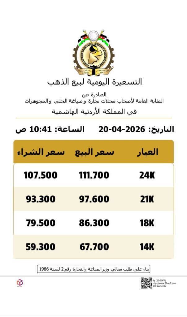 وبلغ سعر غرام الذهب عيار 21 الأكثر تداولا بين المواطنين 97.6 دينارا.وتاليا التسعيرة: