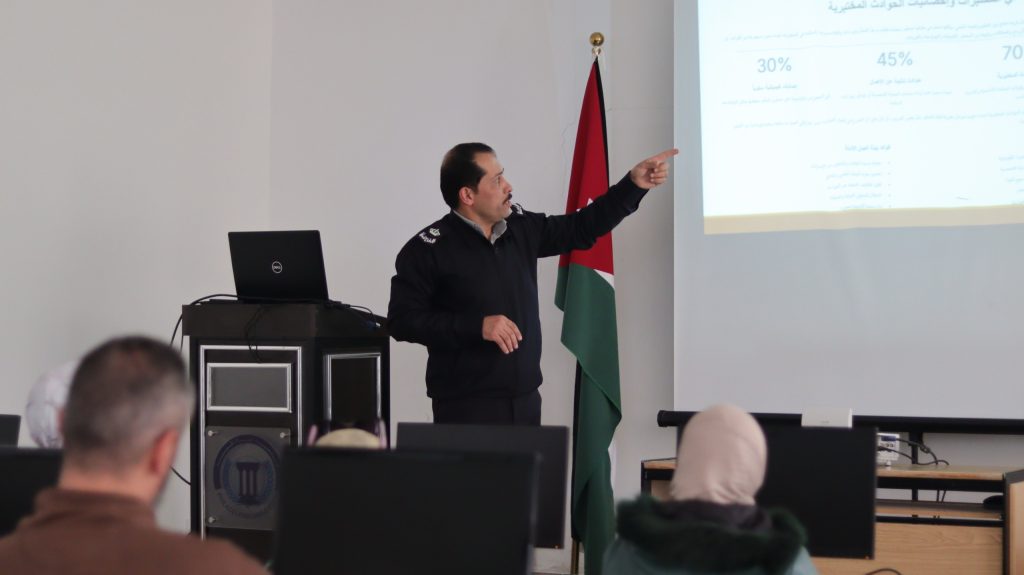 واستعرض المحاضر،الرائد المهندس وسام الخشاشنة، أبرز الأسس والمعايير الدولية للتعامل الآمن مع المواد الكيميائية، مشدداً على ضرورة الالتزام الصارم بإرشادات السلامة العامة وارتداء معدات الوقاية.