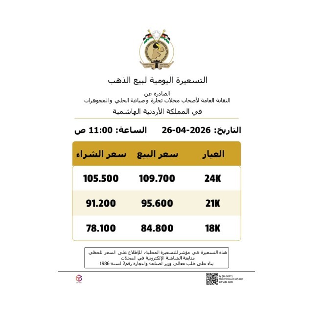 شهدت أسعار الذهب في الأردن، اليوم الأحد، استقرارًا في مستوياتها وفق التسعيرة الصادرة عن النقابة العامة لأصحاب محال تجارة وصياغة الحلي والمجوهرات، وسط ثبات في أسعار المعدن النفيس محليًا.