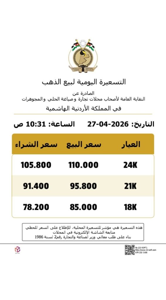 وبلغ سعر غرام الذهب عيار 21 الأكثر تداولا بين المواطنين 95.8 دينارا.