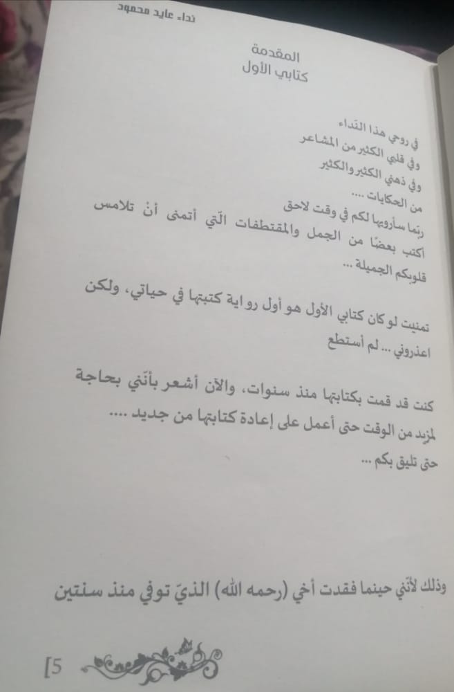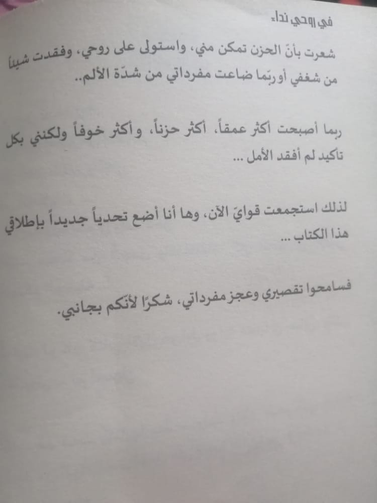 _ولم يكن الكتاب عن قصة حياتي على الإطلاق بل هي مقتطفات من تجاربي في الحياة ومن تجارب الناس من حولي وأتمنى أن تلامس قلوب الناس ويتقبلوها بكل حب و رقي.