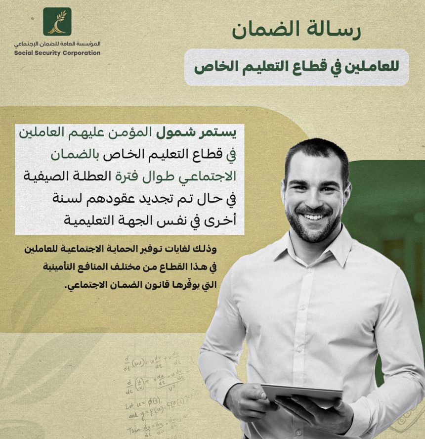 قالت المؤسسة العامة للضمان الاجتماعي، إن المؤمن عليهم بقطاع التعليم الخاص، يستمر شمولهم بالضمان الاجتماعي طوال فترة العطلة الصيفية بشرط واحد.