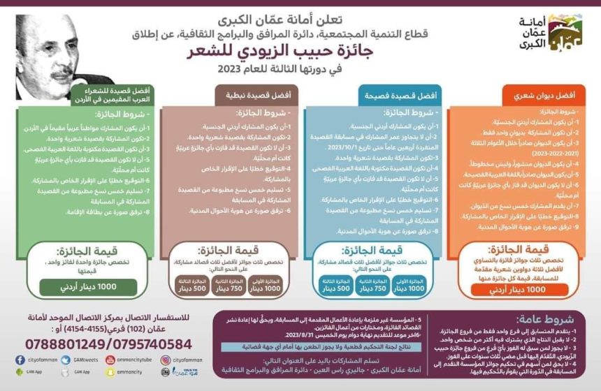 اعلنت أمأنة عمّان الكبرى عن تمديد بابِ التّقدّمِ للدّورةِ الثّالثة من (جائزة حبيب الزّيودي للشّعر) للعام 2023 لمدة اسبوعين جديدين، وحددت آخر موعد لاستقبال المنافسات الشعرية يوم 15 أيلول (سسبتمبر) القادم.
