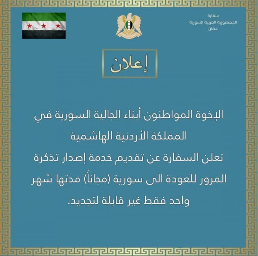 أعلنت السفارة السورية في العاصمة عمان عن تقديم خدمة إصدار وثيقة المرور للعودة إلى سوريا مجانا.