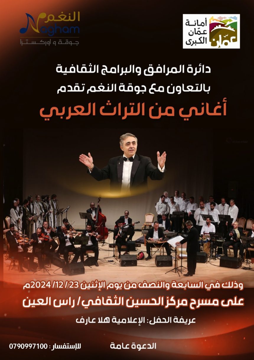 وتنظم حفل “أغاني من التراث العربي” دائرة المرافق والبرامج الثقافية في امانة عمان الكبرى بالتعاون مع جوقة واوركسترا النغم، احياء لتراث الاغنية العربية الاصيل ودعما للحركة الفنية الاردنية، كما يقول مدير الدائرة الزميل عبد الهادي راجي المجالي.