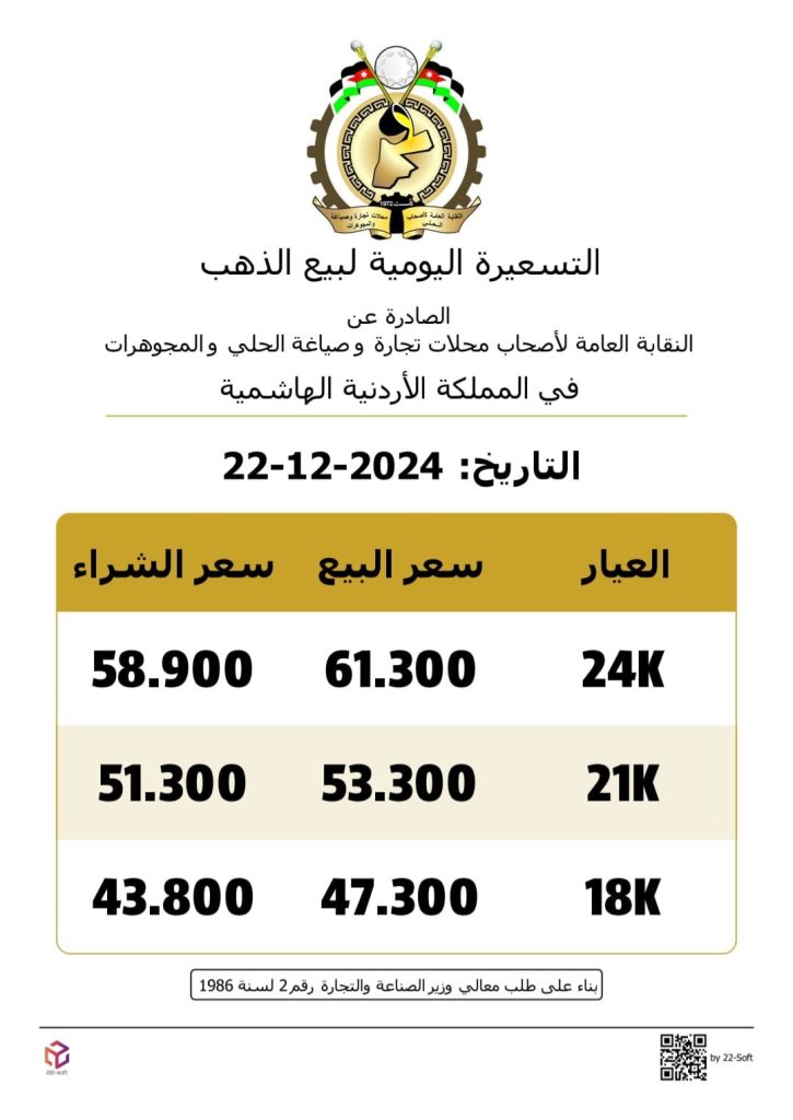 كما بلغ سعر بيع غرام الذهب من عيار 24 نحو 61.3 دينار، في حين بلغ سعر بيع الذهب من عيار 18 نحو 47.3 دينار. وتاليا التسعيرة: