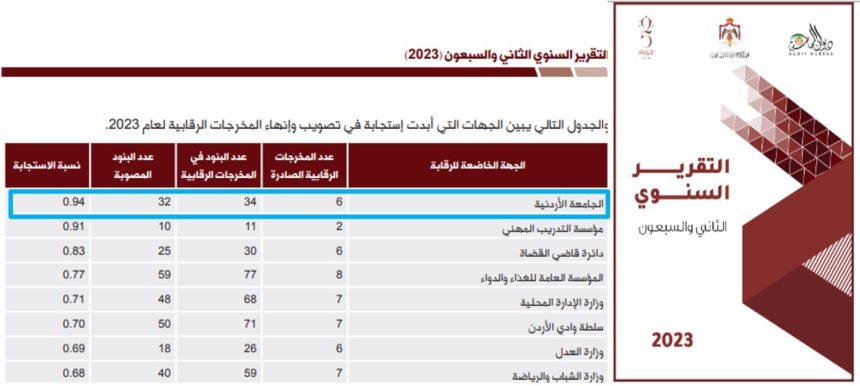 حقّقتِ الجامعةُ الأردنيّةُ أعلى نسبة استجابةٍ بينَ المؤسّساتِ جميعِها في الأردنّ في تصويبِ المخرجاتِ الرّقابيّةِ وإنهائها وفقًا لتقريرِ ديوانِ المحاسبة للعام 2023، بنسبةٍ بلغَت 94%.والجامعةُ الأردنيّةُ إذْ تحقّقُ الإنجازَ تلوَ الانجاز؛ لتؤكّدَ شعارَ حوكمةِ عمليّاتِها “حاكميَّةٌ رشيدةٌ وإدارةٌ معاصرة”، ضمنَ خطّتِها الإستراتيجيّةِ (2022-2027)، بعدّه أحدَ الغاياتِ الإستراتيجيّة.وترنو خطّةُ الجامعةِ الإستراتيجيّةِ إلى تعزيزِ ممارساتِ الحاكميّةِ الرّشيدةِ متضمّنةً التّشاركيّة، والشّفافيّة، والعدالة، والمساءلة، والفعاليَّة، إضافةً إلى ترسيخِ ممارساتِ ضمانِ الجَودة، وتجذيرِ قيمِ الجَودةِ والاعتماد، و تطويرِ الأداءِ المؤسّسيّ؛ لمواكبةِ أفضلِ الممارساتِ العالميّة، إضافةً إلى تعزيزِ التّحوُّلِ الرَّقْمِيّ، وأتمتةِ العمليّاتِ والإجراءات.ويستندُ هذا الإنجازُ إلى رؤيةِ الجامعة؛ لتكونَ قائدةً للتّحوّلِ العلميّ، والتّكنولوجيّ، والاقتصاديّ، والاجتماعيّ، والثّقافيّ، ومتميّزةً في أداءِ دورِها في تطويرِ الدّولةِ الأردنيّةِ وتحديثِها، ورائدةً في خدمةِ المجتمعِ المحليّ، والعالميّ.