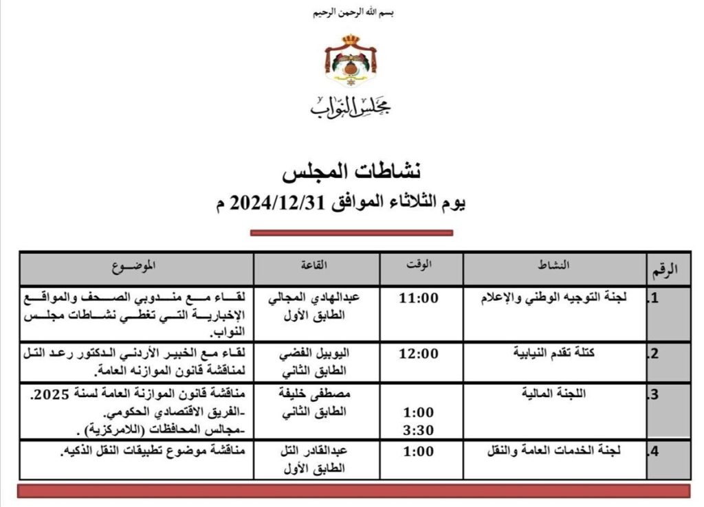 كما تواصل اللجنة المالية النيابية مناقشة قانون الموزانة العامة لسنة 2025 ، وتعقد كتلة نقد النيابية لقاء مع الخبير الاردني الدكتور رعد التل لمناقشة قانون الموازنة العامة.