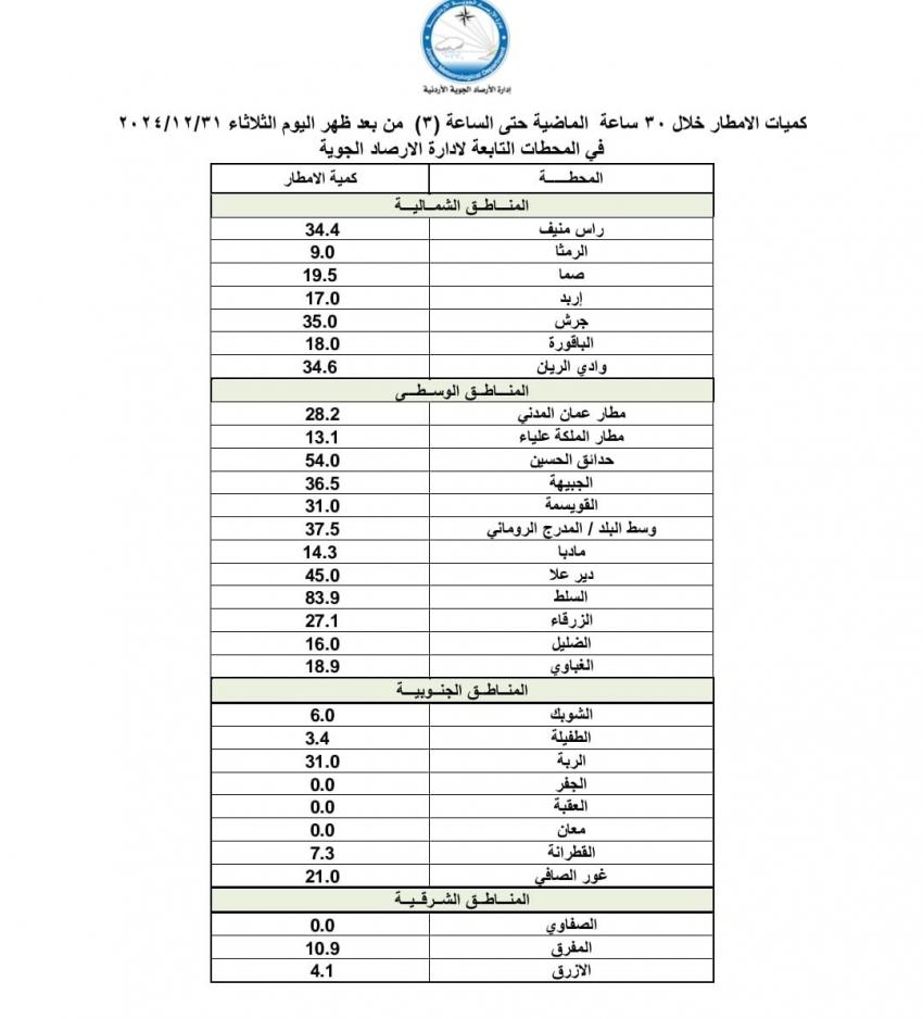 رصدت المحطات التابعة لإدارة الأرصاد الجوية الأردنية، كميات الأمطار التي هطلت خلال الثلاثين ساعة الماضية حتى الساعة الثالثة من بعد ظهر اليوم الثلاثاء31-12-2024.وسجلت مدينة السَّلط أعلى كمية هطول مطري بـ 83,9 ملم وتلتها منطقة حدائق الحُسين في شمال العاصمة عمان بـ 54 ملم ، ثم منطقة لواء ديرعلا بـ 45.0 ملم.وتاليا كميات الأمطار التي هطلت خلال الـ30ساعة الماضية: