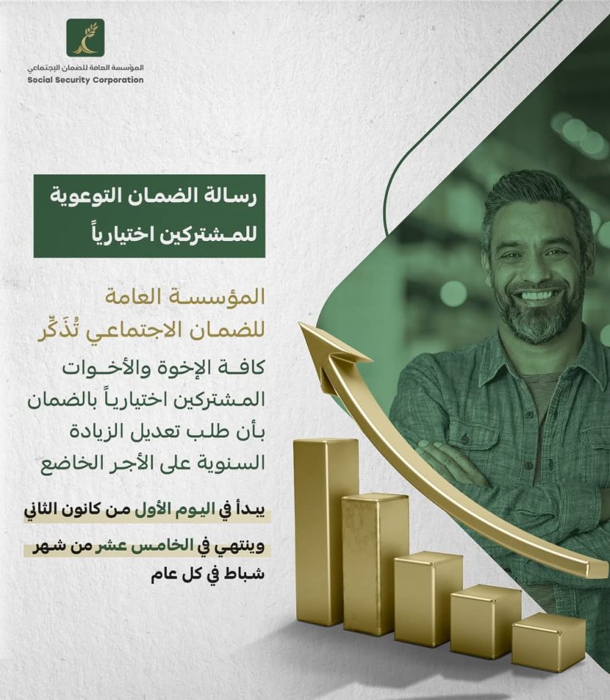 وبينت المؤسسة أن نسبة الزيادة على رواتب المؤمّن عليهم المشمولين بصفة اختيارية بالضمان الاجتماعي متاحة ما بين (1%) و (10%) سنوياً.