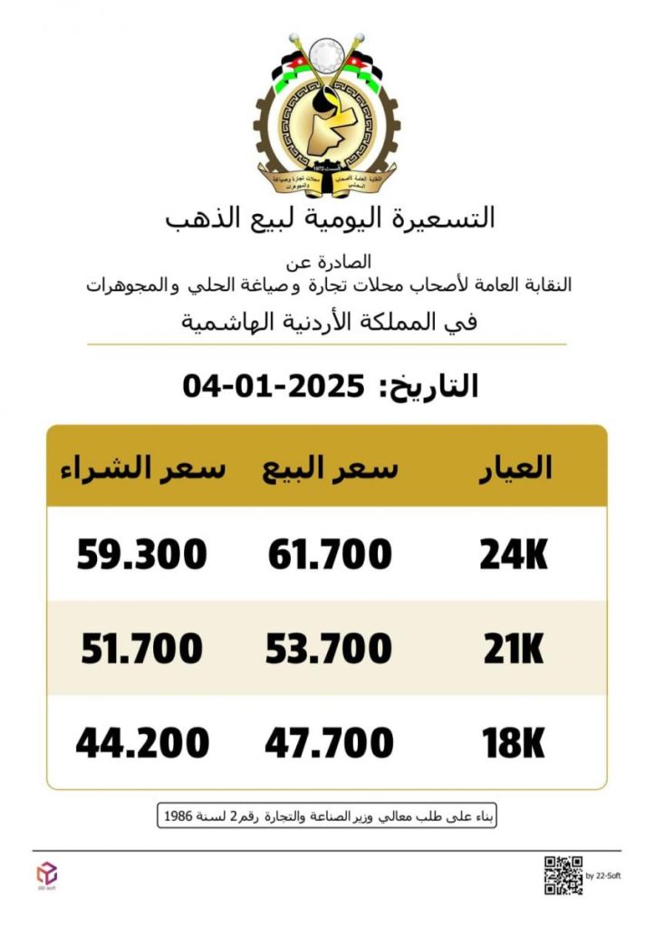وبلغ سعر بيع غرام الذهب عيار 21، في السوق المحلية، 53.7 دينارا في محلات الصاغة، مقابل 51.7 دينارا لجهة الشراء.