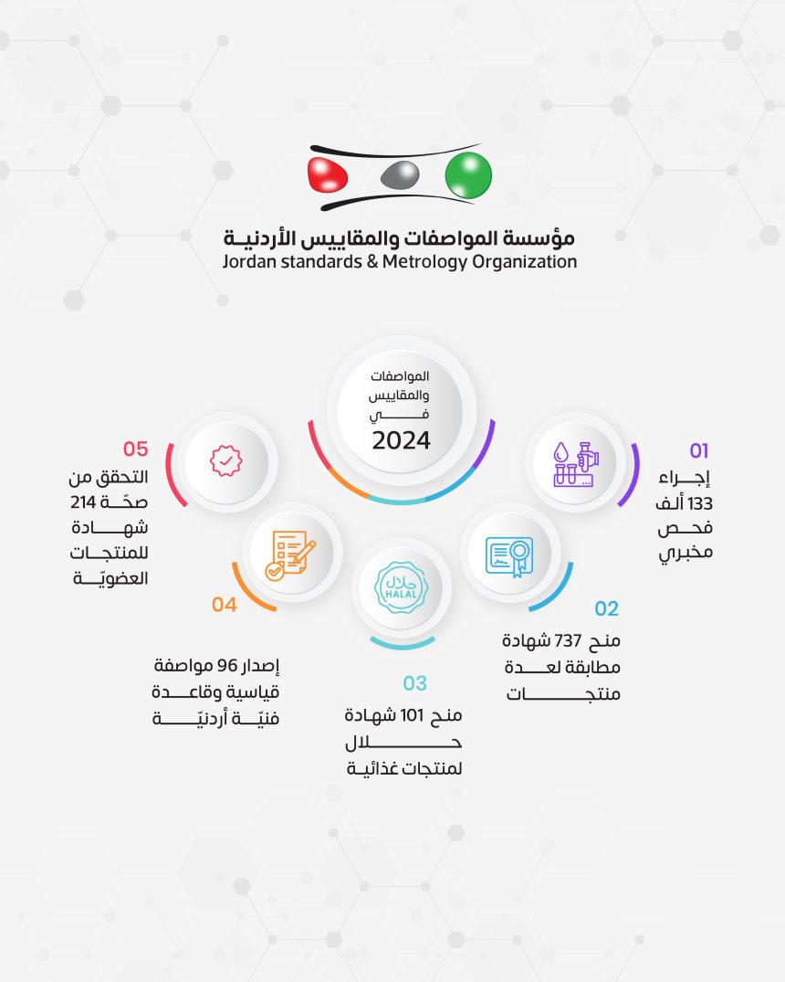 وأكدت الزّهير إلى أنّ المؤسسة تحرص عند إعداد المواصفات القياسية والقواعد الفنية على مواكبة التطوّرات العلمية المتسارعة وتلبية متطلبات القطاعين الصناعي والتجاري وبما يضمن جودة وسلامة المنتجات، وقد أصدرت المؤسسة 96 مواصفة قياسية وقاعدة فنيّة أردنيّة في القطاع الكيماويّ وقطاع الصّناعات الهندسيّة و قطاع المنتجات الغذائيّة، مؤكدة على حرص المؤسسة على دعم الصناعات عالية القيمة التي تعدّ واحدة من أبرز محرّكات النّموّ لتنفيذ رؤية التّحديث الاقتصاديّ.