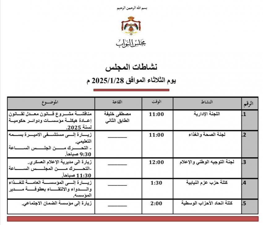 كما تقوم اللجان النيابية زيارات ميدانية إلى مستشفى الأميرة بسمة، وإلى مديرية الإعلام العسكري، وزيارة إلى مؤسسة الغذاء والدواء.