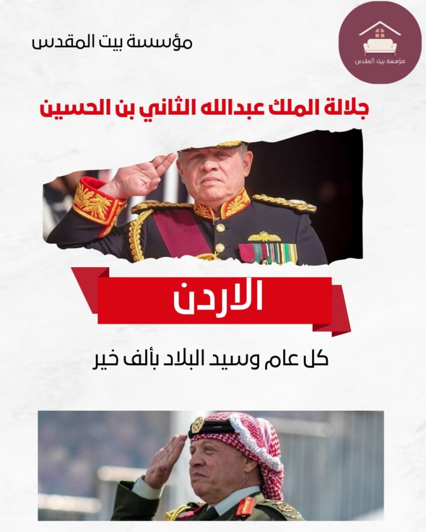 يتقدم كادر مؤسسة بيت المقدس للمفروشات والموبيليا الحديثة متمثلة بمديرها السيد ماجد خطاب من حضرة صاحب الجلالة الملك عبدالله الثاني بن الحسين المعظم حفظه الله ورعاه بأصدق آيات التهنئة والتبريك بمناسبة عيد ميلاده الميمون، متمنين لجلالته العمر المديد ومعاهدينه على ان نبقى جنود الاردن الاوفياء.