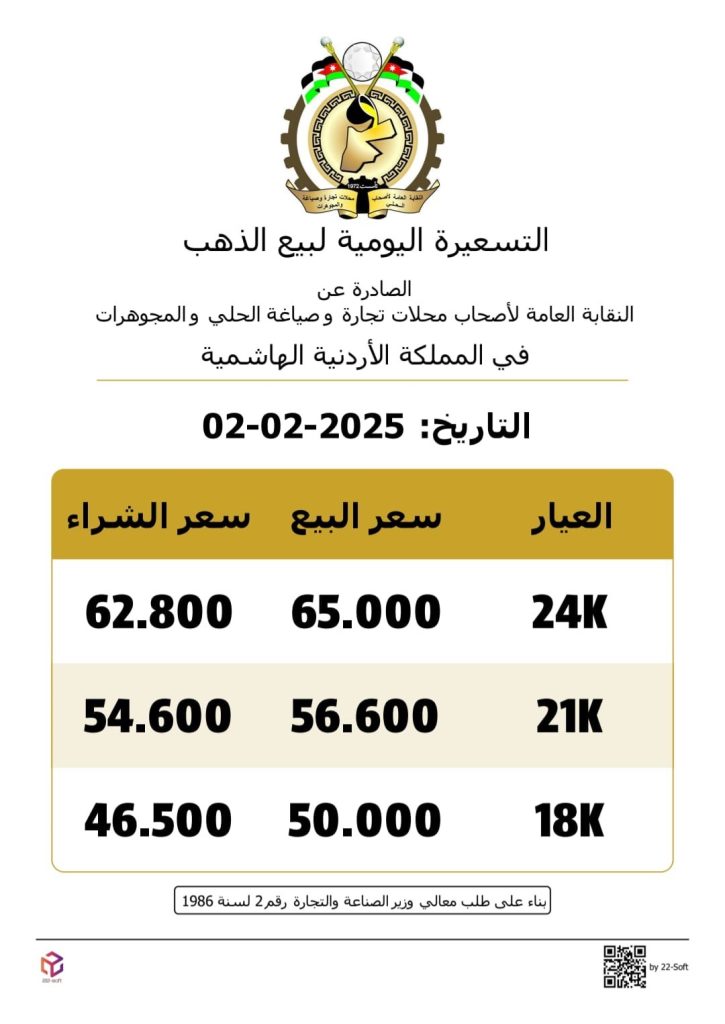 وبحسب التسعيرة اليومية الصادرة عن النقابة العامة لأصحاب محال تجارة الحلي والمجوهرات، بلغ سعر بيع الغرام الواحد من الذهب عياري 24 و18 من محال الصاغة، 65 دينارا و50 دينارا على التوالي.