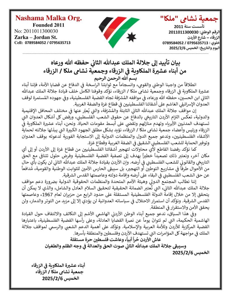 انطلاقاً من واجبنا الوطني والقومي، وانسجاماً مع ثوابتنا الراسخة في الدفاع عن قضايا الأمة، فإننا أبناء عشيرة الملكاوية في الزرقاء وجمعية نشامى ملكا / الزرقاء، نؤكد وقوفنا الكامل خلف قيادة جلالة الملك عبدالله الثاني ابن الحسين، حفظه الله ورعاه، في مواقفه المُشرّفة تجاه القضية الفلسطينية، وفي جهوده المُستمرة لوقف العدوان الإسرائيلي الغاشم على أشقائنا الفلسطينيين في قطاع غزة والضفة الغربية.