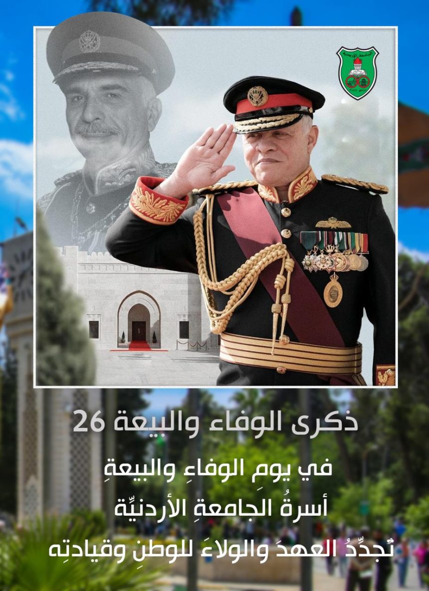 جدّدت أسرةُ الجامعة الأردنيّة، إدارتَها وأعضاءَ هيئتها التدريسيّة وطلبتَها وموظفيها، الولاءَ والانتماءَ لجلالة الملك عبدالله الثاني ابن الحسين، مؤكّدين التفافَهم حول القيادة الهاشميّة الحكيمة في يوم البيعة، الذي يجسّد أسمى معاني الوفاء للوطنِ وقائدِه.