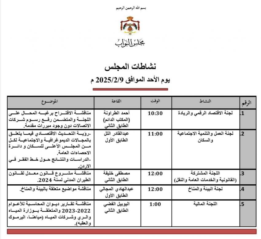 وتناقش اللجنة المالية تقارير ديوان المحاسبة للأعوام 2022-2023، لوزراة المياه وشركات المياه (مياهنا، اليرموك، العقبة).