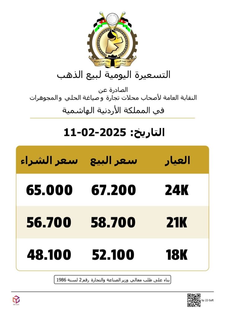 وبحسب النشرة التي تصدرها النقابة العامة لأصحاب محال تجارة وصياغة الحلي والمجوهرات، بلغ سعر بيع الغرام من الذهب عياري 24 و18 لغايات الشراء من محال الصاغة، 67.20 و52.10 دينارا على التوالي.