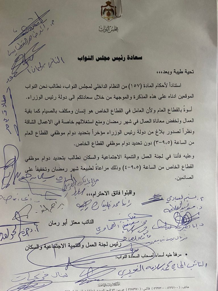 وأكد رئيس اللجنة، النائب معتز أبو رمان، أن الحكومة حددت ساعات العمل في القطاع العام، لكنها لم تشمل القطاع الخاص بقرار مماثل.