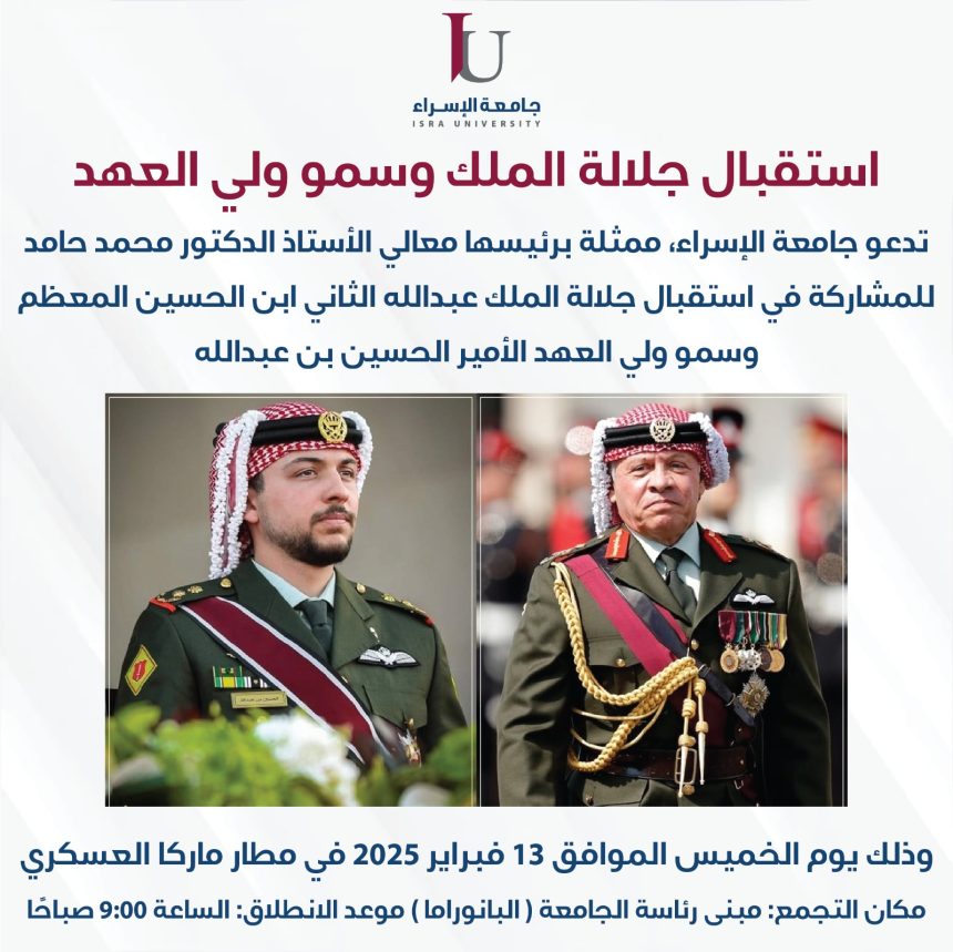 تدعو جامعة الإسراء، ممثلة برئيسها معالي الأستاذ الدكتور محمد حامد، للمشاركة في استقبال جلالة الملك عبدالله الثاني ابن الحسين المعظم، وسمو ولي العهد الأمير الحسين بن عبدالله، وذلك يوم الخميس الموافق 13 فبراير 2025 في مطار ماركا العسكري.