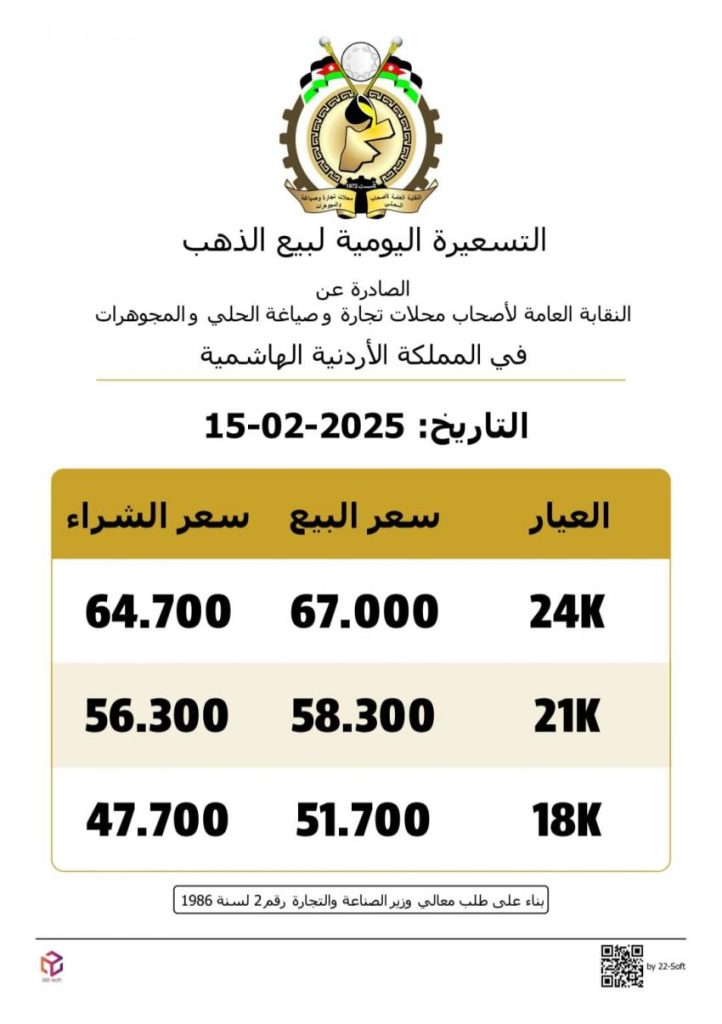 وبحسب التسعيرة اليومية الصادرة عن النقابة، بلغ سعر بيع الغرام الواحد من الذهب عياري 24 و18 من محال الصاغة، 67.00 دينارا و51.70 دينارا على التوالي.
