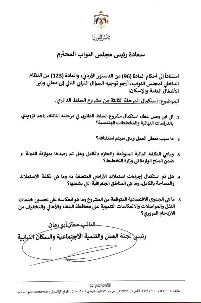 وجه النائب معتز أبو رمان، رئيس لجنة العمل والتنمية الاجتماعية والسكان النيابية، سؤالًا نيابيًا إلى وزير الأشغال العامة والإسكان حول استكمال المرحلة الثالثة من مشروع السلط الدائري، وذلك استنادًا لأحكام المادة (96) من الدستور الأردني والمادة (123) من النظام الداخلي لمجلس النواب.