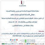 تماشيًا مع قرار دولة رئيس الوزراء ، ونظرا للظروف الجوية السائدة في المملكة، قرر الدكتور ايمن مقابلة عميد الكلية الجامعية الوطنية للتكنولوجيا تأخير دوام اعضاء الهيئات التدريسية والادارية والطلبة خلال ايام الأحد والاثنين والثلاثاء المقبلة الموافق 23 و24 و25 شباط الى الساعه العاشرة صباحا وحتى الرابعة مساء”باستثناء من تقتضي طبيعة عملهم غير ذلك .