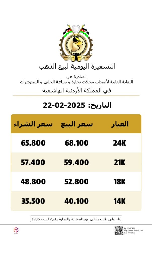كما بلغ سعر غرام الذهب من عيار 24، 68.1 دينارا، فيما بلغ سعر غرام الذهب من عيار 18، 52.8 دينارا.