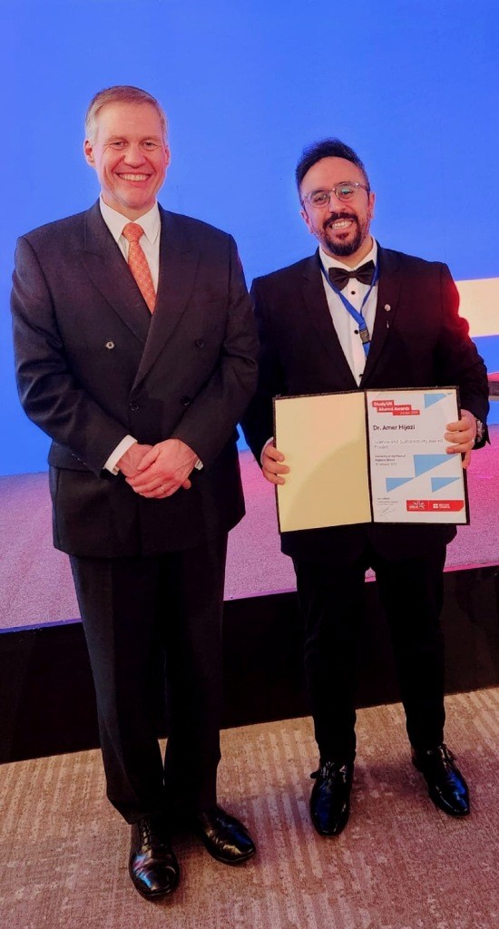 وقد تم تسليم الجائزة من سعادة السيد فيليب هول OBE، سفير المملكة المتحدة في الأردن، وذلك بحضور الأستاذ الدكتور ظافر الصرايرة، رئيس هيئة اعتماد مؤسسات التعليم العالي وضمان جودتها. كما شهد الحفل عددا من ممثلي قطاع التعليم العالي، ورؤساء الجامعات، وخريجي المملكة المتحدة، وكبار الشخصيات الأكاديمية الأردنية.