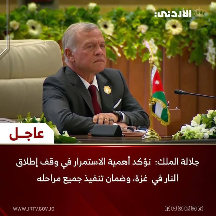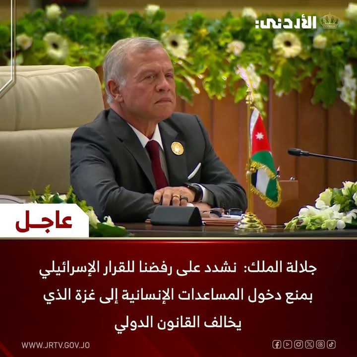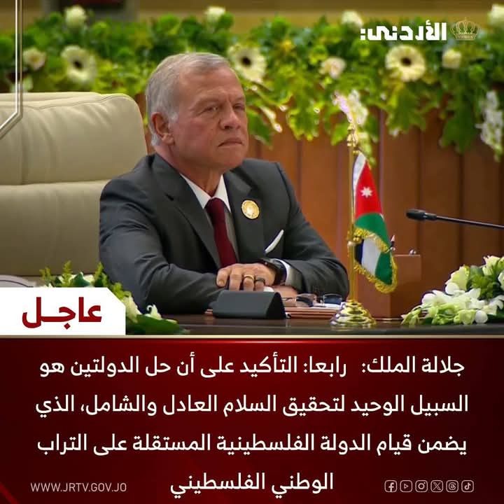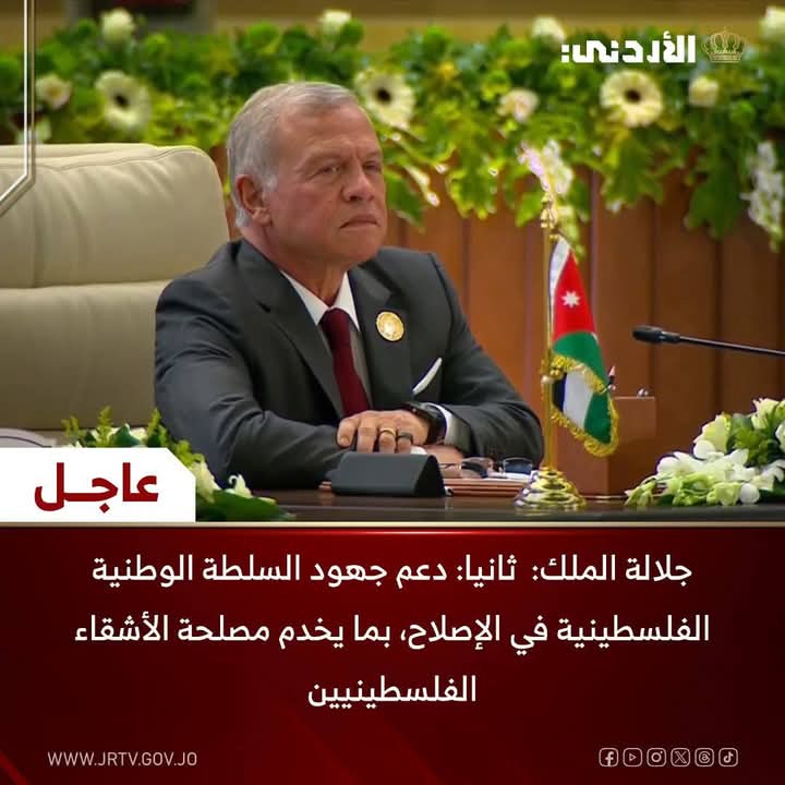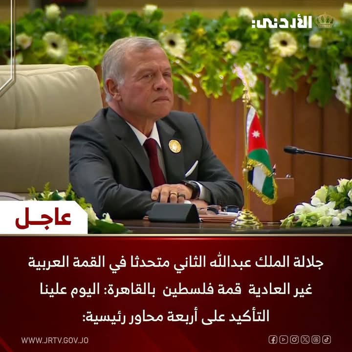 يؤكد أمين عام حزب البناء والعمل، الدكتور زياد الحجاج، دعمه الكامل وتأييده المطلق لما جاء في كلمة جلالة الملك عبدالله الثاني ابن الحسين، حفظه الله ورعاه، خلال القمة العربية المنعقدة اليوم في القاهرة، والتي جدد فيها الأردن موقفه الثابت تجاه القضية الفلسطينية وحقوق الشعب الفلسطيني المشروعة.