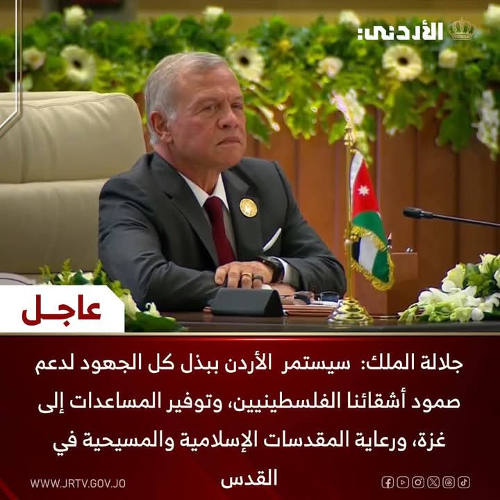 ويؤكد على ما أعلنه جلالة الملك بأن الأردن سيواصل واجبه التاريخي في رعاية المقدسات الإسلامية والمسيحية في القدس، وسيمضي في تقديم المساعدات الإنسانية إلى غزة برًا وجوًا، التزامًا بدوره القومي والإنساني تجاه القضية الفلسطينية.