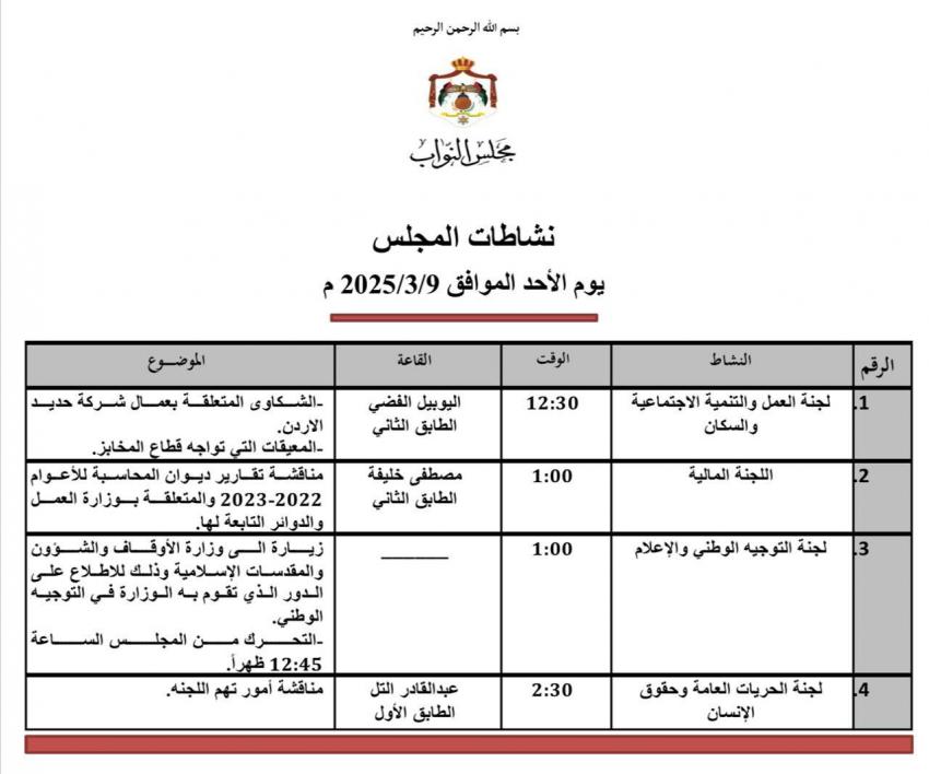 ومناقشة الشكاوى المتعلقة بعمال شركة حديد الأردن من قبل لجنة العمل النيابية.