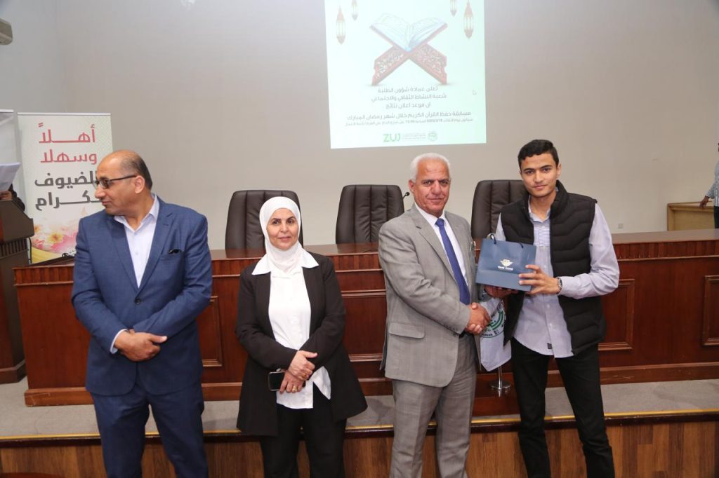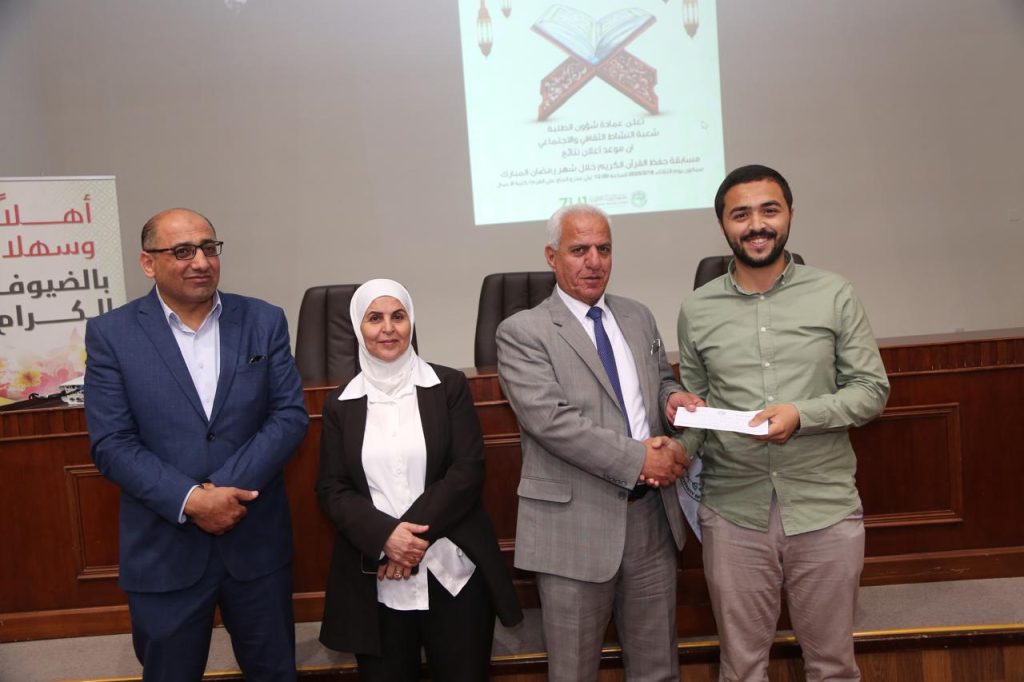 وفي ختام الحفل، قام عميد شؤون الطلبة، الدكتور منير العفيشات، بتكريم الفائزين بحضور لجنة المسابقة وعدد من الأساتذة. حيث هنأهم على إنجازهم وحثهم على الاستمرار في قراءة وحفظ القرآن الكريم والمشاركة في الأنشطة التي تنظمها العمادة.