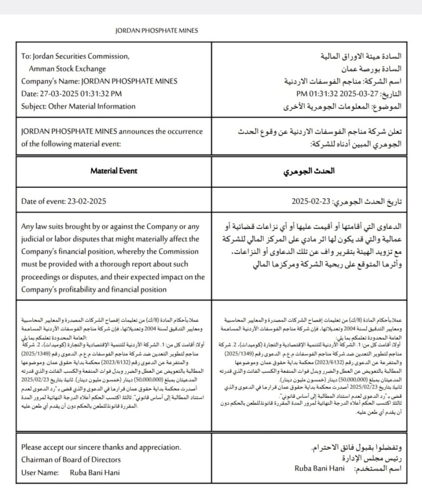 افصحت شركة مناجم الفوسفات الأردنية عبر موقع هيئة الأوراق المالية عن كسبها قرارا قطعيا برد الدعوى المقامة عليها